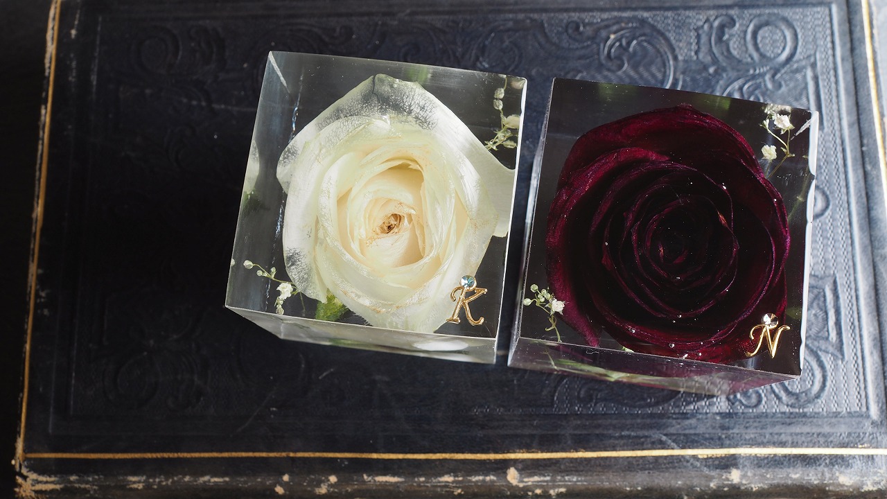 ドライフラワーやプリザーブドフラワーに比べて劣化が少ないことからレジンに決めました。