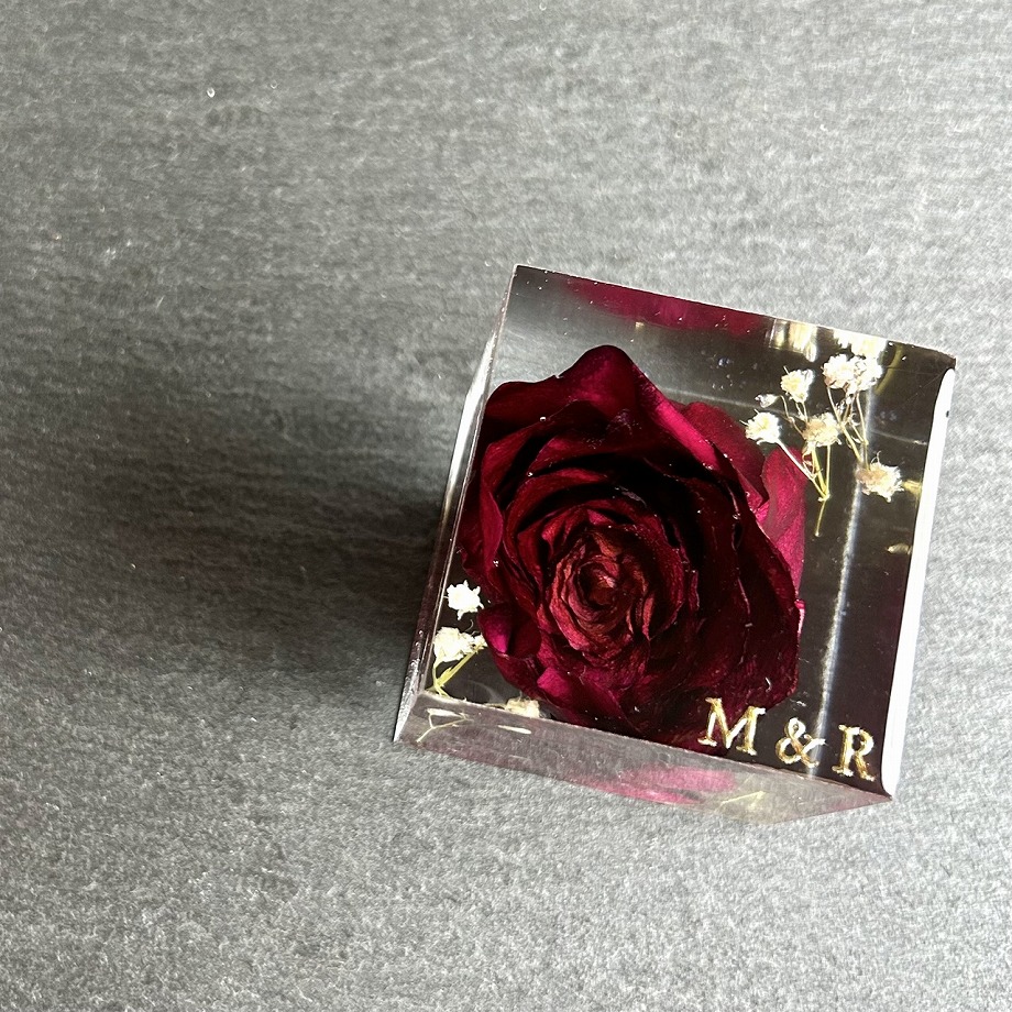 制作事例2025.05.052025.11.17【制作事例】パートナーと一緒にレジンで残すことを決めた case756 ポスト シェア はてブ 送る Pocket神奈川県横浜市にお住まいのM様からご依頼いただきました。ご依頼頂いた商品プロポーズのバラのキューブオブジェの商品ページはこちらキューブオブジェ表面before お客様からお預かりしたものお預かりしたお花ドライフラワーお客様の感想私がプロポーズの前にhappyresinさんのサイトを見つけたのがきっかけで、プロポーズの後に使ったバラをレジンに封入して残すことを提案して、彼女も制作事例の写真などを見て気に入って注文に至りました注文後もこまめに進捗のご連絡を頂いて、納品まで不安になることなく、完成品を楽しみに過ごすことが出来ました制作工程は事前に伺っていた期間より短く、実際には1ヶ月と数日で完成品が手元に届きました手元に完成品が届いて、写真で見た通りの美しさでとても満足しておりますご依頼デザインキューブオブジェバラかすみそうイニシャル M&Rプロポーズの想いをカタチに残す 商品一覧ページはこちら関連記事お客さまの想い出をカタチにした制作事例